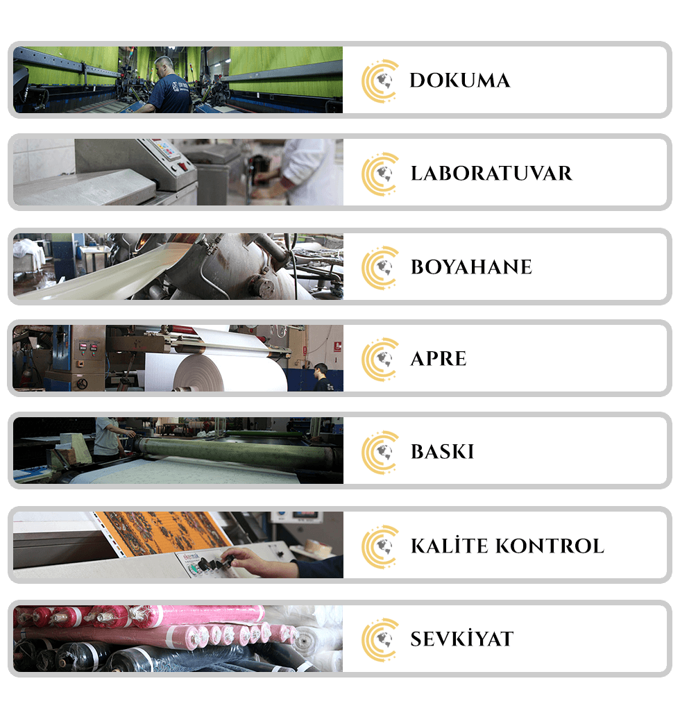 ÜRETİM PARKURUMUZ; DOKUMA - LABARATUAR - APRE - BASKI - KALİTE KONTROL VE SEVKİYAT OLMAK ÜZERE, EN İYİ VE EN KALİTELİ ÜRÜNLERİ, SON TEKNOLOJİLERİ KULLANARAK EN HIZLI ŞEKİLDE SUNMAYA ÇALIŞMAKTAYIZ. ÜRÜN ÇEŞİTLERİMİZ; FLOK BASKI, VARAK BASKI, EŞARP BASKI, BAYRAK BASKI, FANTEZİ BAYAN GRUBU, ERKEK GÖMLEKLİK GRUBU, EV TEKSTİLİ, TRANSFER BASKI, DÜZBOYA, ŞARDON, CRASH, DEVORE(YAKMA) BASKI.